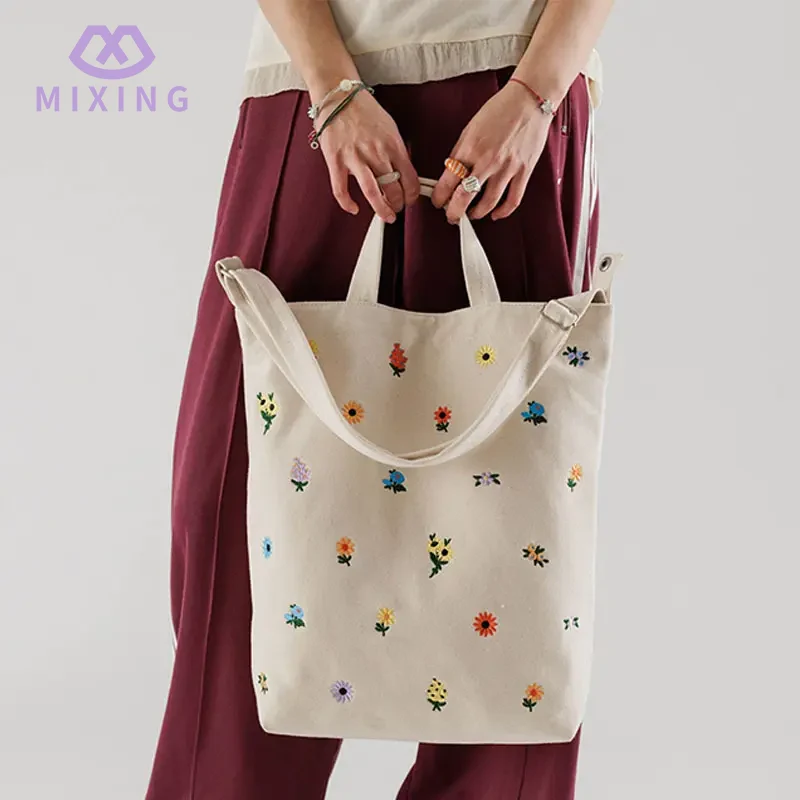 De stof van de China geborduurde draagtas voor dames, geproduceerd door Mixing, voelt zacht aan maar heeft textuur, het is niet licht en vormloos. Het blijft knapperig als het gevuld is met spullen en kreukt niet en plakt niet aan het lichaam, ook als het gevuld is met meerdere boeken of een thermoskan, ligt het stevig vast en ziet het er netjes uit.